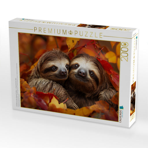 Herbstliche Geborgenheit Erleben Sie die herzerwärmende Szene unseres KI-generierten Bildes: Eine liebevolle Faultiermutter umarmt zärtlich ihr Ki...